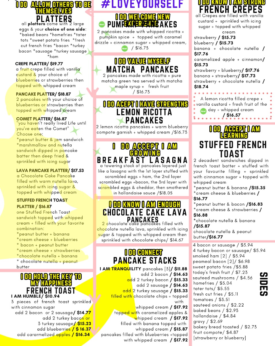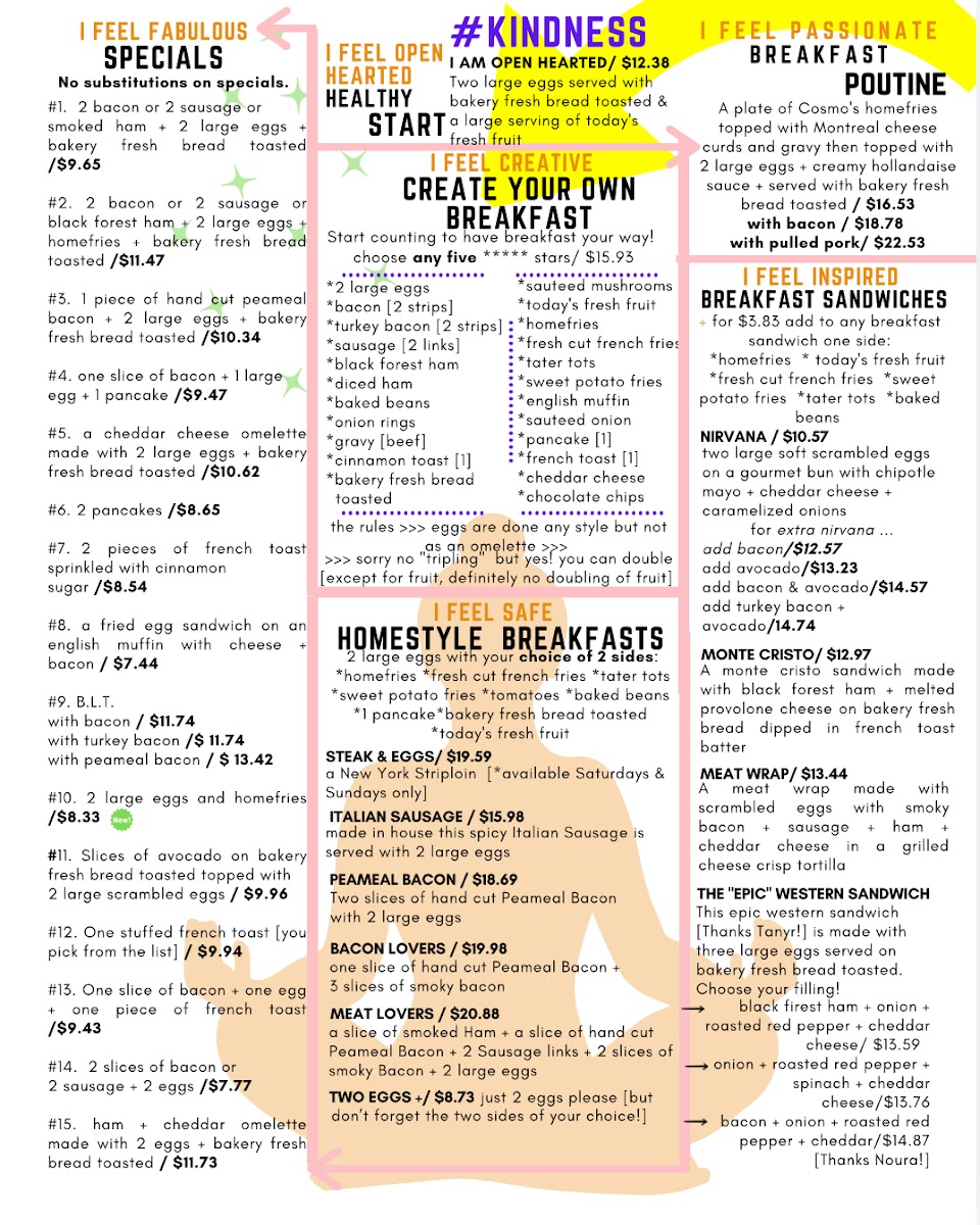My friend and I come to Cosmo's all the time and we love it! We usually get the 'YOU ARE FABULOUS' (two eggs, bacon, home fries and toast). Eggs and bacon are always made exactly to order (soft poached, crispy bacon, thank you very much.) The service is impeccable! Friendly, efficient, and attentive - even when a surprise walk-in group of 30 hockey players pops by, my food arrives quickly, hot, and delicious. I love that the coffee comes with a carafe and my cup is always full. The music and decor is fifties and fun. Amenities are clean. Prices are very reasonable. Highly recommend.