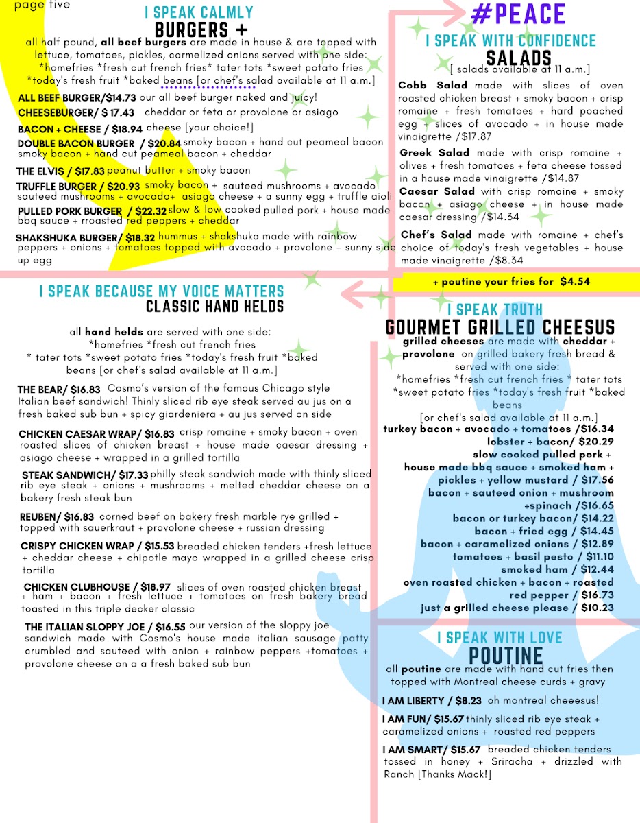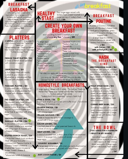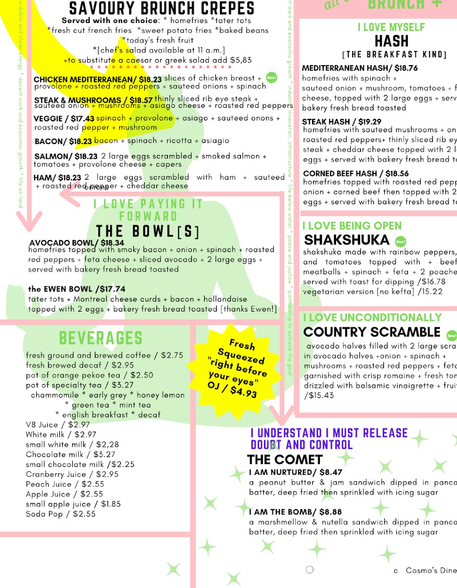 The menu at Cosmo's Diner also caters to a variety of dietary preferences, with options like the Vegetarian Avocado Toast and the Mediterranean Hash showcasing the restaurant's commitment to offering something for everyone. Whether you're a meat lover or a vegetarian, you're sure to find something to satisfy your cravings at Cosmo's.